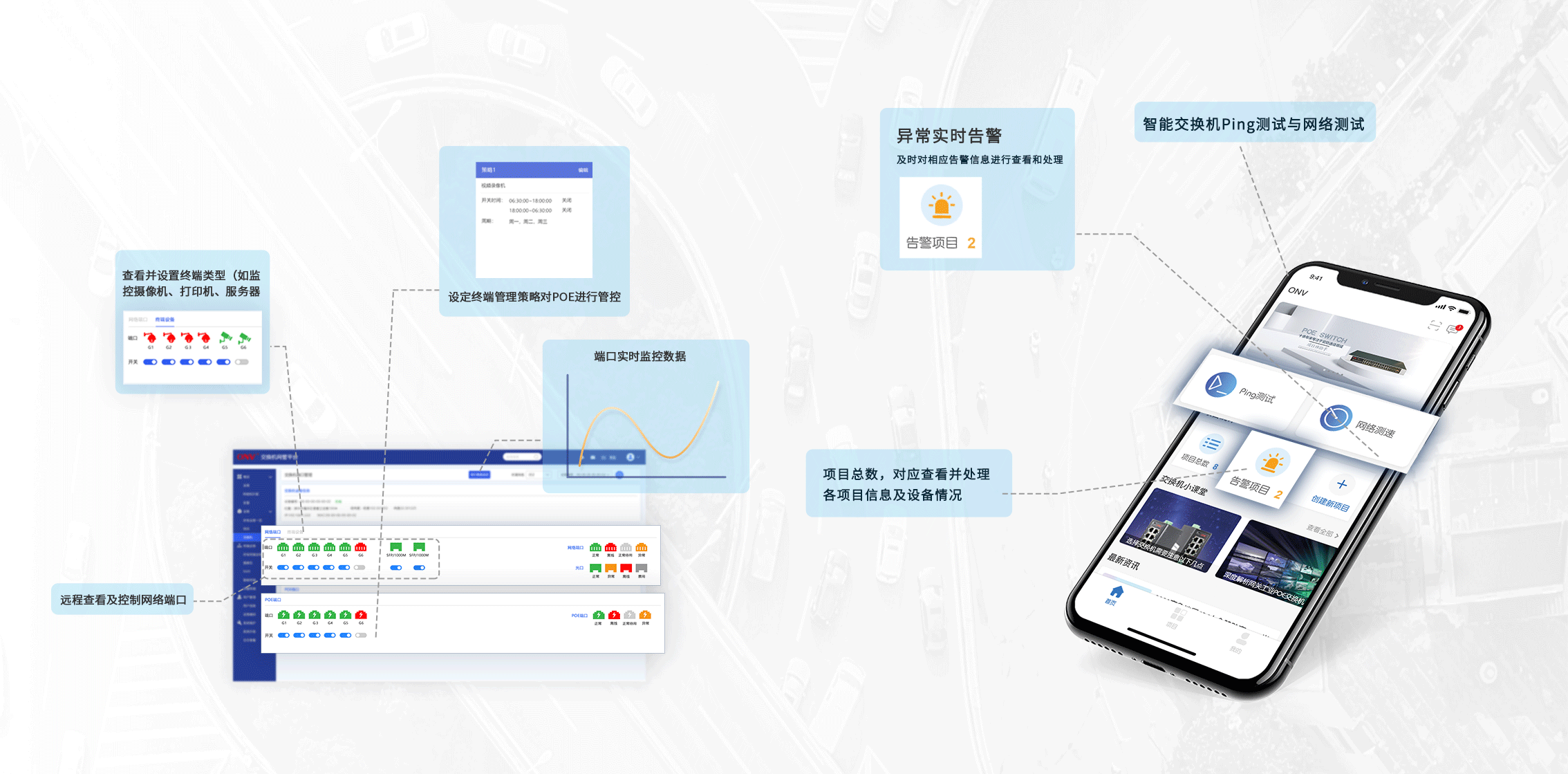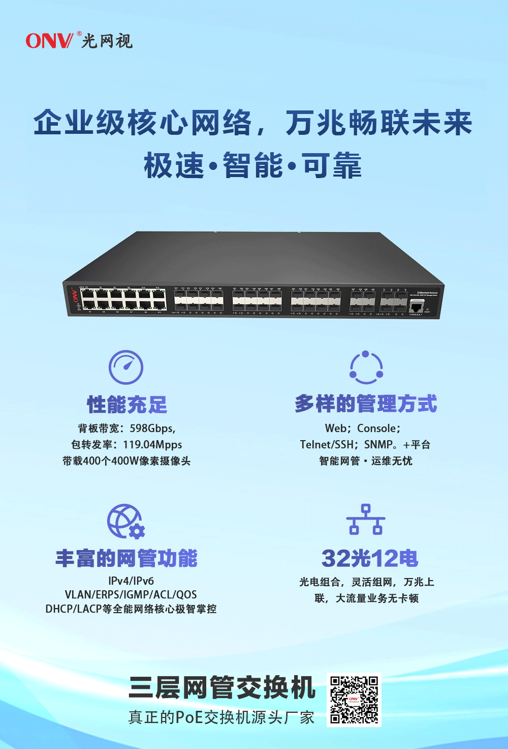 面對上述挑戰(zhàn),項(xiàng)目選用了光網(wǎng)視(ONV)的工程級三層核心以太網(wǎng)交換機(jī)作為網(wǎng)絡(luò)傳輸?shù)暮诵幕?。該方案完美契合了高空拋物監(jiān)控對網(wǎng)絡(luò)基礎(chǔ)設(shè)施的嚴(yán)苛要求: