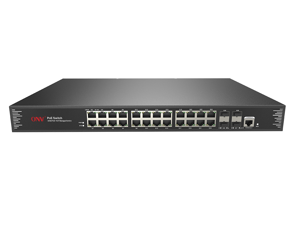 ONV-POE33028PFM系列是ONV自主研發(fā)的全千兆二層網(wǎng)管PoE光纖交換機(jī),支持24個(gè)10/100/1000Base-T自適應(yīng)RJ45口+4個(gè)100/1000Base-X SFP光口插槽。其中1-24端口支持IEEE 802.3af/at標(biāo)準(zhǔn)PoE供電,單端口PoE功率達(dá)30W,整機(jī)最大PoE輸出功率為400W(at-600W)。作為PoE供電設(shè)備,能自動檢測識別符合標(biāo)準(zhǔn)的受電設(shè)備并通過網(wǎng)線為其供電。可通過網(wǎng)線為無線AP、網(wǎng)絡(luò)攝像頭、網(wǎng)絡(luò)電話機(jī)、樓宇可視門禁對講等POE終端設(shè)備供電,滿足對高密度PoE供電有需求的網(wǎng)絡(luò)環(huán)境,適合酒店、校園、園區(qū),商超,景區(qū)、廠區(qū)宿舍及SMB中小型企業(yè)組建經(jīng)濟(jì)高效的網(wǎng)絡(luò)。