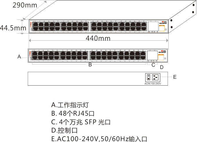 48個(gè)10/100/1000Base-T RJ45端口(Data) 4個(gè)1/10G 萬兆SFP+上聯(lián)光口 (Data) 1個(gè)Console RS232控制口(115200,N,8,1) |