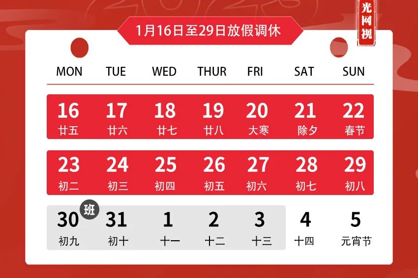 結(jié)合我司的具體情況,公司春節(jié)放假時間是2023年1月16日至1月29日,1月30日(正月初九)正常上班。