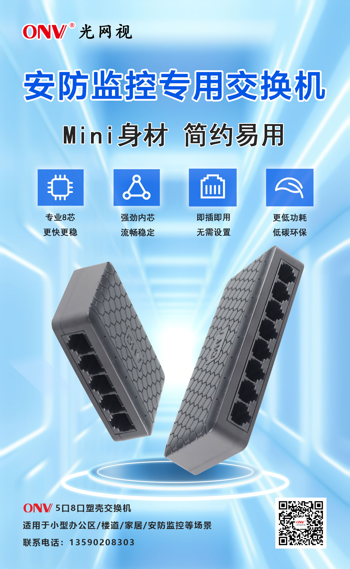ONV光網(wǎng)視 光網(wǎng)視科技 202024年將至,光網(wǎng)視安防監(jiān)控專用交換機(jī)火熱上市,全新塑殼產(chǎn)品——"Mini身材,簡(jiǎn)約易用"的5口/8口安防監(jiān)控專用交換機(jī),一款專為家庭、校園、辦公室等簡(jiǎn)易網(wǎng)絡(luò)環(huán)境設(shè)計(jì),高品質(zhì),價(jià)格親民。最重要的是
