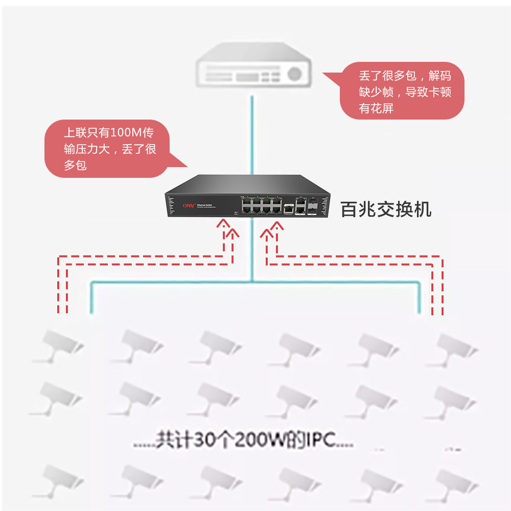 1個交換機上連接了40個H.265 200W像素的攝像頭(2+0.5),上聯(lián)端口的轉(zhuǎn)發(fā)率為2.5*40=100M>70M,就需要使用千兆交換機。交換機有1個端口需要是千兆,那就需要選型全千兆交換機,或者上聯(lián)口必須為千兆口的交換機。
