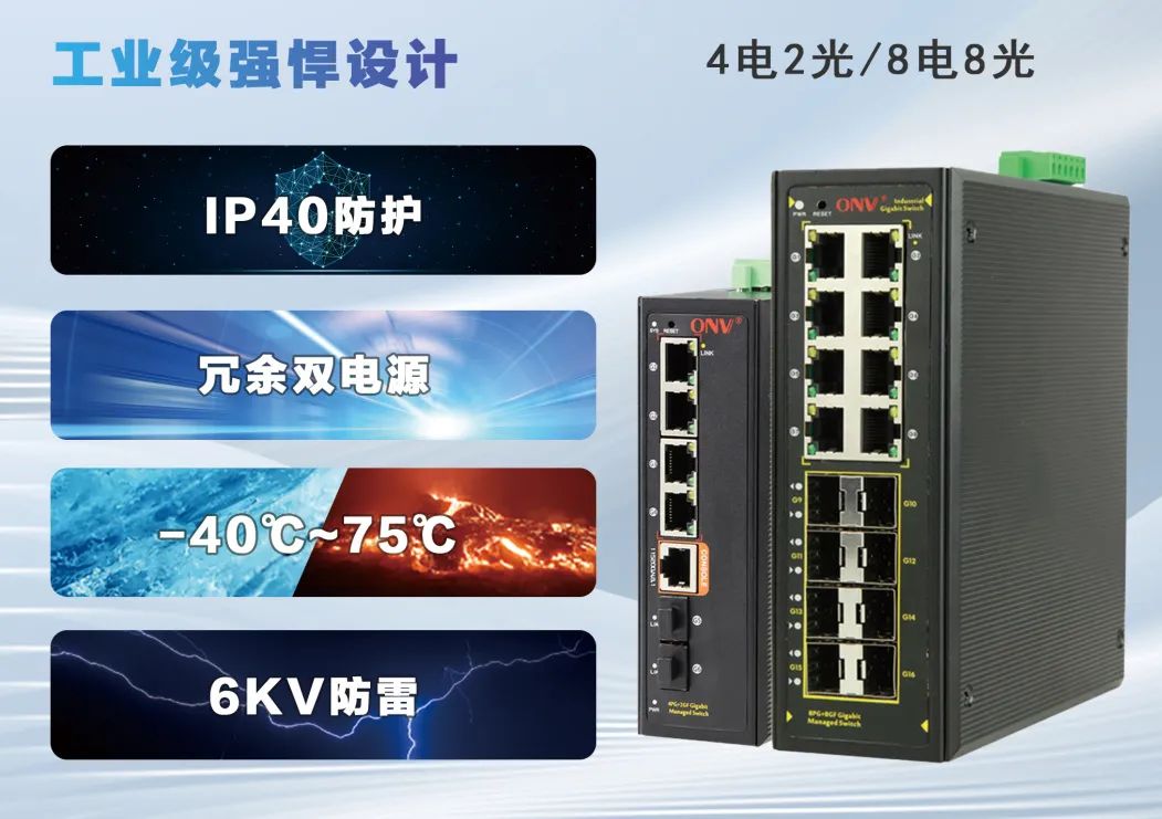 在區(qū)域機柜,部署光網(wǎng)視高性能工業(yè)網(wǎng)管匯聚交換機(8電口+8光口),構(gòu)建光纖骨干環(huán)網(wǎng),匯聚多個接入點數(shù)據(jù)。
